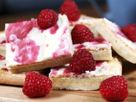 12With the leftover raspberries, decorate your Milkybar® covered tray bake by placing them on top in a pattern.